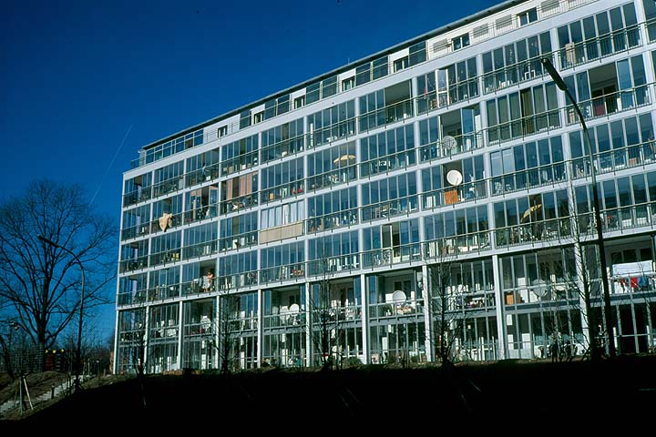 ドイツでは環境共生住宅には、自然をいっぱいとりこんだエコロジカルなタイプをはじめ、さまざまな環境共生の方法を試行している。ここはマンションで、一見冷たいデザインのように受け取れるが、大きな開口部のあちこちではところどころ犬が昼寝をしており、住む人にとって暖かそうにみえた。この背後にはこどもたちが遊びやすい中庭がある。