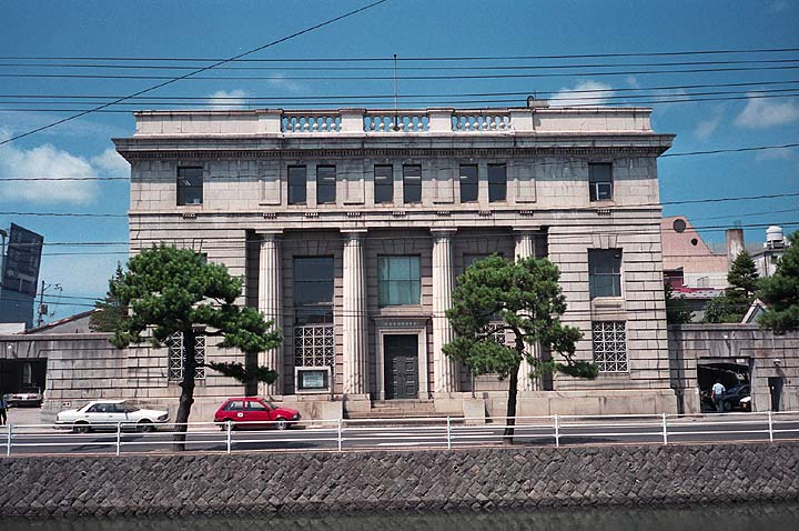松江の中心街は川をはさんで大きく二つにわかれている。ここは川の北側の一角で、当時は金融業(日銀支社)が営まれる歴史的建造物だった(1989年)。